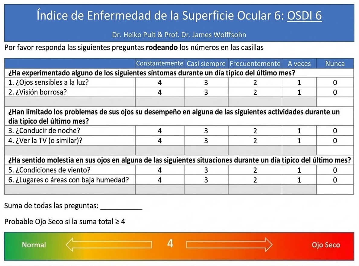 • Cuestionario OSDI-6 (simplificado): Primer paso recomendado por DEWS III. Puntuación ≥4 sugiere EOS sintomática. Sustituye al OSDI-12 como cribado [5]