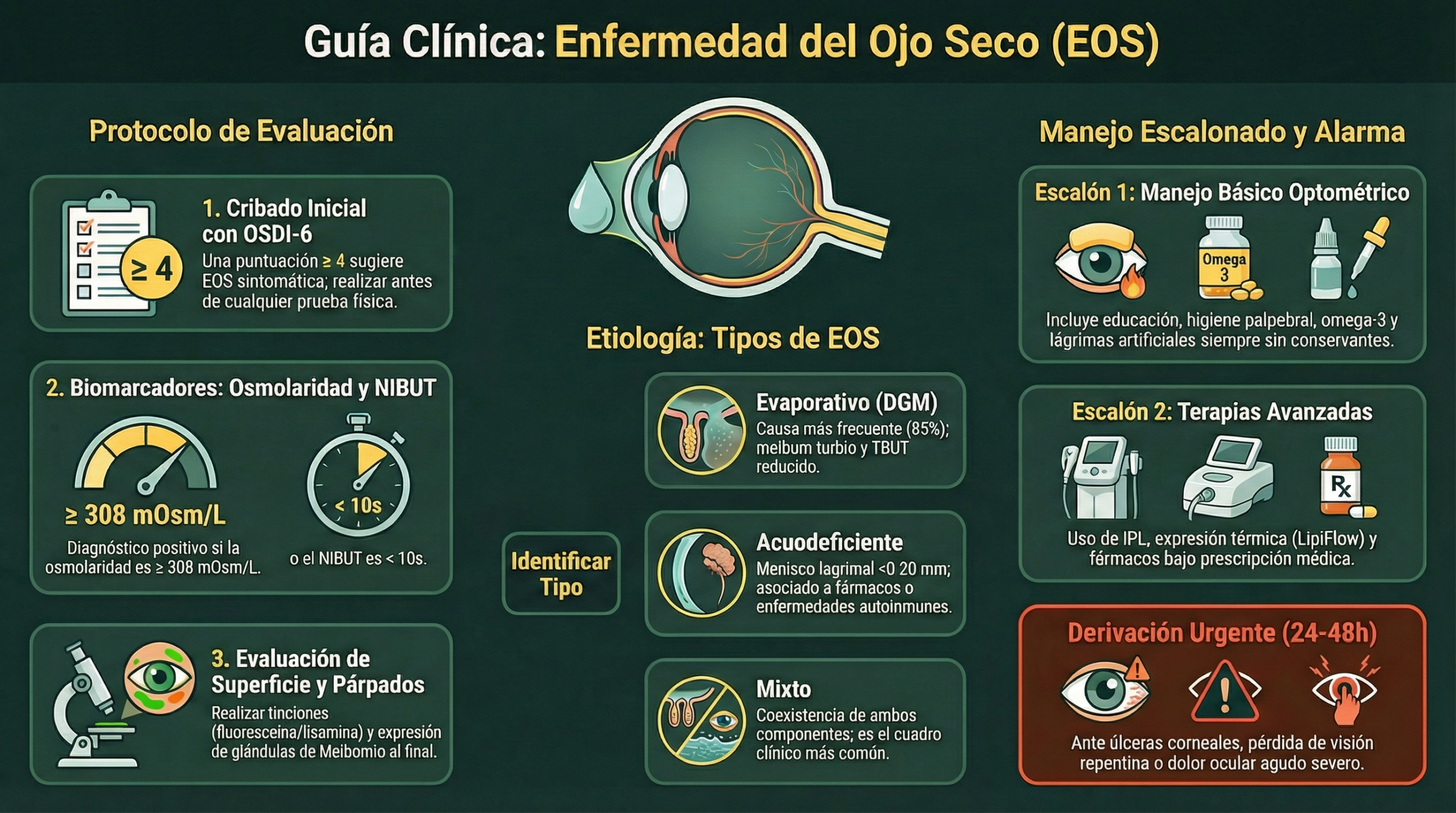 El oftalmólogo es quien diagnostica y trata el ojo seco. El optometrista debe tener conocimientos sobre el ojo seco para derivar los casos sospechosos.